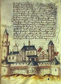 - Unter dem Urkundentext Ansicht der Burg Friedberg von Westen.