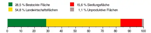 Es besteht zu 28,5 % aus bestockter Fläche, zu 54,8 % aus Landwirtschaftsfläche, zu 15,6 % aus Siedlungsfläche und zu 1,1 % aus unproduktiven Flächen.