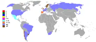 - Nicht qualifiziert: 12× (54,5 %; 1974, 1978, 1986, 1990, 1994, 1998, 2002, 2006, 2010, 2014, 2018 und 2022)