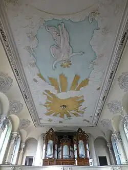 - Spielhilfen: Crescendo-Walze, eine Freie Kombination, feste Kombinationen (mechanisch programmierbar - p, mf, f, ff, tutti), Handregister, Zungen ab, Generalkoppel.