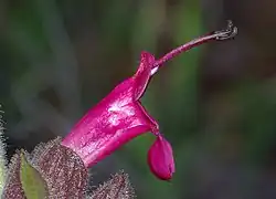 Die zwittrige Blüte ist zygomorph und fünfzählig mit doppelter Blütenhülle. Die fünf 1,5 bis 2 Zentimeter langen, spatelförmigen Kelchblätter sind dunkel-weinrot bis rotbraun und stark drüsig behaart. Die 3 bis 4,5 Zentimeter lange, dunkelrosa bis purpurrote Blütenkrone besteht aus einer 2 bis 3,5 Zentimeter lange Kronröhre und zwei ungleichen Kronlippen. Ihre Oberlippe ist 5 bis 10 Millimeter lang sowie flach. Die Unterlippe ist 6 bis 14 Millimeter lang und zurückgebogene unter mit einem breiten, verkehrt-eiförmigen mittleren Kronlappen. Die Staubblätter ragen weit über die obere Kronlippe hinaus.[2][1]