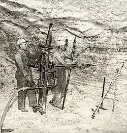 Historische Aufnahme des Salzabbaus mit Pressluftbohrhammer in einem Bergwerk in Kansas, USA (1910er oder frühe 1920er Jahre)