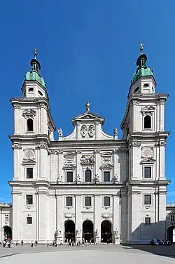 Die Kritik an der autoritären Macht des Erzbischofs nahm unter Keutschach weiter zu. 1525 belagerten aufständische Knappen und Bauern die Festung Hohensalzburg, in der sich Erzbischof Matthäus Lang von Wellenburg verschanzt hatte. Erst mit Hilfe von erkauften Truppen des Schwäbischen Bundes konnten die Aufständischen zum Rückzug gezwungen werden. Das Erzstift zählte um 1600 durch Salz- und Goldbergbau zu den reichsten Fürstentümern im römisch-deutschen Reich. Damals gestaltete Erzbischof Wolf Dietrich von Raitenau den Altstadtkern neu.[16] Der große spätromanische Dom wurde abgerissen und durch Markus Sittikus im frühbarocken Stil wieder aufgebaut.[17]