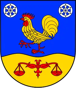 Die Wappenbeschreibung lautet: „Über goldenem Wellenschildfuß, darin ein roter Waagebalken mit zwei roten Waagschalen, in Blau ein goldener rotbewehrter schreitender Hahn, oben umrahmt von zwei silbernen Wagenrädern.“