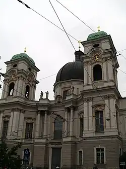Die Dreifaltigkeitskirche ist der größte Kirchenbau aus fürsterzbischöflicher Zeit der inneren Rechtsstadt und befindet sich am oberen Ende des Makartplatzes. Die als Zentralbau gestaltete Kirche entstand 1694–1702 und ist das erste Bau von Johann Bernhard Fischer von Erlach in Salzburg. Als Vorbild dienten dabei römische Sakralbauten. Auffallend ist bei dieser Kirche bereits die dezente Verwendung der Schmuckelemente, die sich dem architektonischen Gesamtwerk unterordnen. Der Bau war nicht auf den Makartplatz gerichtet, sondern in eine damals schmale Seitenstraße zwischen der äußeren Bergstraße (heute Rainerstraße) und der Linzer Gasse. Das gegenüber der Kirche dort stehende fürsterzbischöfliche Leihhaus wurde erst 1907 abgerissen. Folglich schwingt der zentrale Kirchenbau in Schaffung eines kleinen leicht erhöhten Kirchenvorplatzes in der Straßenflucht nach innen. Die ursprünglich niedrigen Kirchtürme wurden für eine bessere Erkennbarkeit der Kirche hinter dem Leihhaus erst später erhöht (Glockengeschoße 1757, Turmhaubenaufsätze nach 1818), was aber Gesamtbild der Kirche nicht verbessern konnte. Der architektonische Mittelpunkt der weitläufigen Anlage mit den beiden großen Flügelbauten des Priesterseminars, die zusammen mit der zentralen Kirche eine einheitlich komponierte Fassade bilden, sollte vielmehr die mächtige zentrale Tambourkuppel der Kirche darstellen. Über dem äußeren Kirchportal stehen auf der Attika vor der Kuppel die Figuren der drei theologischen Tugenden und die Figur der Göttlichen Weisheit, die von Bernhard Michael Mandl geschaffen wurden. Das große Kuppelfresko im Inneren der Kirche gestaltete Johann Michael Rottmayr zwischen 1697 und 1700. Der Hochaltar ist nach Plänen von Fischer von Erlach gefertigt (1700 geschaffen, 1841 überarbeitet, 1947 in den ursprünglichen Zustand rückgeführt) und besitzt eine plastische Gruppe der Dreifaltigkeit mit zwei anbetenden Engeln. Das angeschlossene Priesterhaus ist um zwei symmetrische Höfe herum angeordnet. Im nördlichen Innenhof ist der von Josef Anton Pfaffinger geschaffene mittige Brunnen mit dem Heiligen Petrus (1741) erwähnenswert. Der mittige Brunnen im südlichen Kolleghof stammt von 1857.