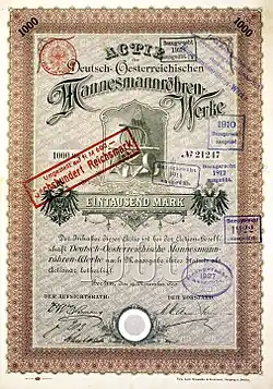 1890 als Zusammenschluss mehrerer Röhrenwerke der Remscheider Brüder Max und Reinhard Mannesmann unter dem Namen Deutsch-Österreichische Mannesmannröhren-Werke AG mit Sitz in Berlin gegründet, wurden 1893 die Verwaltung und später der Unternehmenssitz nach Düsseldorf verlegt, das damals das Zentrum der deutschen Stahlröhrenindustrie war.[2] 1897 wurde in Rath das Werk für die Produktion von nahtlosen Rohren in Betrieb genommen. 1908 erhielt das Unternehmen den neuen Namen Mannesmannröhren-Werke AG und entwickelte sich in der Folge über die Röhrenproduktion hinaus zu einem der großen deutschen Stahlkonzerne mit eigener Stahlproduktion.