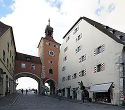 - ↑ Baudenkmäler Regensburg. (pdf) Bayerisches Landesamt für Denkmalpflege, S. 143, abgerufen am 8. August 2014: „Ehem. städtischer Salzstadel, dreigeschossiges und traufständiges Lagerhaus mit abgewalmtem Satteldach zu fünf Speichergeschossen, über unregelmäßigem Grundriss, Erdgeschoss durch Sandsteinpfeiler in drei Schiffe unterteilt, darüber mächtige Holzkonstruktionen, 1616-20; zusammen mit Brückentorturm, 14. Jh.; siehe unter Brückstraße 2.“