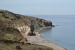 Residualgips eines an die Erdoberfläche durchgebrochenen Salzstocks (das helle Material in der linken Bildmitte) in einem Küstenaufschluss auf Cape Breton Island, Nova Scotia, Kanada.