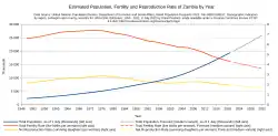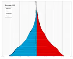 Sambia hatte 2023 20,7 Millionen Einwohner.[14] Das jährliche Bevölkerungswachstum betrug + 2,8 %. Zum Bevölkerungswachstum trug ein Geburtenüberschuss (Geburtenziffer: 34,1 pro 1000 Einwohner[15] vs. Sterbeziffer: 6,7 pro 1000 Einwohner[16]) bei. Die Anzahl der Geburten pro Frau lag 2022 statistisch bei 4,2.[17] Die Lebenserwartung der Einwohner Sambias ab der Geburt lag 2022 bei 61,8 Jahren[18]. Der Median des Alters der Bevölkerung lag im Jahr 2021 bei 16,9 Jahren.[19] Im Jahr 2023 waren 42,0 Prozent der Bevölkerung unter 15 Jahre,[20] während der Anteil der über 64-Jährigen 1,9 Prozent der Bevölkerung betrug.[21] Die staatliche Zuständigkeit für die Aufgaben der landesweiten amtlichen Statistik liegt bei der Zambia Statistics Agency.