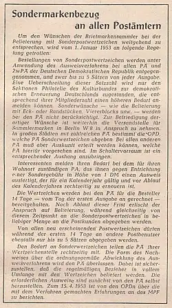 Alle bisherigen Verfügungen zum Verkauf und der Dauerbezug von Postwertzeichen der DDR wurden mit Wirkung vom 1. September 1959 neu geregelt: Der Verkauf von Sonderpostwertzeichen war weiterhin in Mengen bis zu 5 Stück je Ausgabe an einen Käufer zulässig. Die Marken konnten bei den Postämtern im Ausweisverfahren oder bei der Versandstelle in Berlin bezogen werden. Die genaue Regelung umfasste 11 Seiten mit Information. Für die Mitarbeiter der Deutschen Post wurden die Sammlerausweise zum Bezug von Postwertzeichen ab 1. Mai 1960 gebührenfrei ausgestellt.