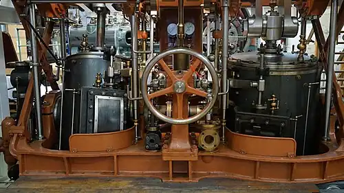 Dampf­maschine der Giessbach III von Escher Wyss mit oszillierendem Zylinder (links der Hochdruckzylinder, in der Mitte der Maschinenstand)