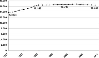 Bei den Zahlen handelt es sich um Fortschreibungen des Landesbetriebs für Statistik und Kommunikationstechnologie Niedersachsen[2] auf Basis der Volkszählung vom 25. Mai 1987.