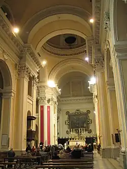 Das Innere hat einen basilikalen Grundriss mit drei Schiffen, die kreuzförmige Kirche ist 58,75 m lang und am Querschiff 24 m breit, die Laterne der Vierungskuppel ragt 36 m hoch.[5] Das Hauptschiff ist von einem Tonnengewölbe mit Lünetten bedeckt, während die beiden Seitenschiffe, die sich links und rechts vom Hauptschiff befinden, von Tonnengewölben bedeckt sind, die orthogonal zum Gewölbe des Hauptschiffs angeordnet sind. Für die natürliche Beleuchtung sorgen im Kirchenschiff sechs Lünetten, drei auf jeder Seite, und in der Kuppel die Laternenfenster.