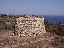 Von Nadur kommend, befindet sich auf dem Weg zur San Blas Bay eine typisch maltesische Hütte, eine sogenannte Girna. Diese Hütten dienen dem Schutz von Hirten und als Lagerplatz. Etwas weiter entfernt befindet sich der Ta’ Sopu Tower. Er wurde unter Großmeister Nicolas Cotoner errichtet und war ein Teil der maltesischen Befestigungsanlagen, die unter den Johannitern entstanden.