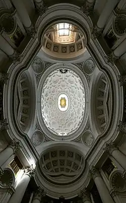 Die reich gegliederte, geschwungene Fassade wird durch einen breiten Architrav horizontal zweigeteilt und mit jeweils vier Säulen in der oberen und in der unteren Hälfte in drei Achsen gegliedert. Diese umschlossenen Konkav- und Konvexnischen sind mit plastischem Schmuck reich ausgestattet. Das rhythmische Spiel mit vor- und rückschwingenden Gebäudeteilen wurde wegweisend für die barocke Architektur.