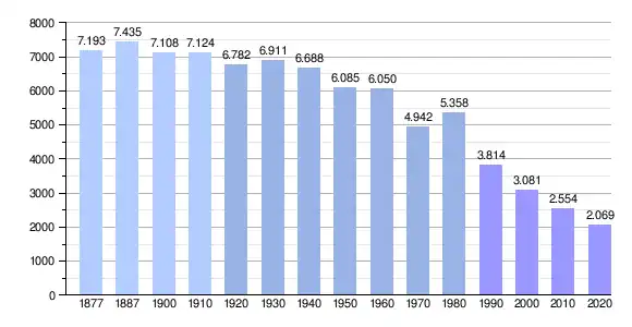 Die kontinuierliche Bevölkerungsrückgang in der zweiten Hälfte des 20. Jahrhunderts ist im Wesentlichen auf die Mechanisierung der Landwirtschaft und den damit einhergehenden Verlust an Arbeitsplätzen zurückzuführen.[4]