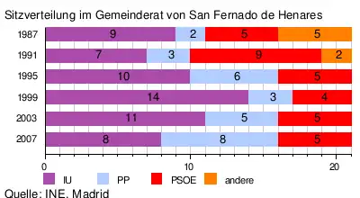 Bei den Kommunalwahlen von 2007 erreichte der Partido Popular sein bestes Ergebnis im Beobachtungszeitraum seit 1987.[11] Im Gegenzug war das Ergebnis der Sozialisten (IU) das schlechteste seit 1991 und sie verloren die absolute Mehrheit, die sie seit 1999 innehatten. Nur die kleinste Partei im Stadtrat, die PSOE konnten ihr noch durch eine Koalition auf die Regierungsbank helfen.