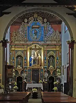 Der Hauptaltar zeigt in der unteren Ebene zwei Durchgangsöffnungen. Die mittlere Ebene weist drei Nischen auf. In der linken Nische befindet sich eine Figur des Juan Bautista, des Schutzpatrons der ersten Kapelle. Die farbig gefasste Figur wird dem, zu Beginn des 17. Jahrhunderts in Sevilla tätig gewordenen Meister Andrés de Ocampo zugeschrieben. In der Mitte befindet sich eine Kreuzigungsgruppe in deren Zentrum die Figur des Cristo del la misericordia steht, die der aus La Laguna stammende Bildhauer Domingo Pérez Dónis vor 1645 geschaffen hat. Das Kreuz ist in einer Nische umgeben von einer Dolorosa des Bildhauers Francisco Liza und einem San Juan Evangelista des Bildhauers Mengual. In der rechten Nische befindet sich die Figur eines San Francisco. Es handelt sich um eine Arbeit, die ein unbekannter kanarischer Künstler um das Jahr 1700 geschaffen hat. In der oberen Ebene, im Abschluss, befindet sich das Relief einer Mariendarstellung unter einem Baldachin.