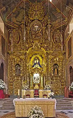 Der Hauptaltar der Kirche ist von besonderer kunsthistorischer Bedeutung. Er wurde im Jahr 1733 geschnitzt und in den Jahren 1736 bis 1739 vergoldet.[7] Er wird als einer der interessantesten des Archipels angesehen.[8] Das gilt besonders für die außergewöhnliche pflanzliche und die bildhafte Ausschmückung. Die Figur der Unbefleckten Empfängnis ist die Arbeit des aus La Orotava stammenden Künstlers Nicolas Perdigón Oramas. Auf der linken Seite des Altars befindet sich eine aus Südamerika stammende Figur des Heiligen Franz von Assisi aus dem 18. Jahrhundert. Die Figur des Heiligen Dominikus auf der rechten Seite ist die Arbeit eines unbekannten Künstlers aus dem 17. Jahrhundert. Sie stammt aus dem aufgelösten Dominikanerkloster in Santa Cruz de Tenerife.[9] Die Decke des Hauptaltarraums trägt Malereien im portugiesischen Stil, die die Krönung der Jungfrau durch die Dreieinigkeit darstellen. Die Seitenwände zeigen z. T. in Grisaillemalerei, die dem Künstler Carlos Acosta zugeschrieben werden, Szenen, die sich auf die Eucharistie beziehen.[10] Die Flächen über den Bögen zwischen den Seitenschiffen und den Kapellen sind mit Freskomalereien aus dem späten 18. Jahrhundert bedeckt. Als besonders interessant gilt die Bemalung auf dem Feld über dem Bogen zwischen dem Hauptschiff und dem Hauptaltarraum. Sie zeigt eine Darstellung der Maria Immaculata, die, unterstützt von Karl III. und dem Franziskanerorden, für das Dogma der unbefleckten Empfängnis kämpft.[11]