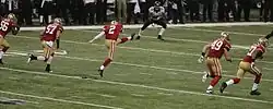 Sportlich prägten neben Quarterback Y. A. Tittle vor allem Halfback Hugh McElhenny, die Fullbacks Joe Perry und John Henry Johnson (diese vier wurden auch als das Million Dollar Backfield und The Fabulous Foursome bekannt)[13] diese Zeit. Das Quartett wurde als einziges Full-House-Backfield (Drei Runningbacks stehen hinter dem Quarterback[14]) in die Pro Football Hall of Fame gewählt.[15] Die Runningbacks brachten jeweils ihre unterschiedlichen Stärken in die Offensive ein – McElhenny war ein sehr beweglicher Spieler, Perry extrem schnell, der muskulöse Johnson dagegen ein starker Vorblocker.[16]