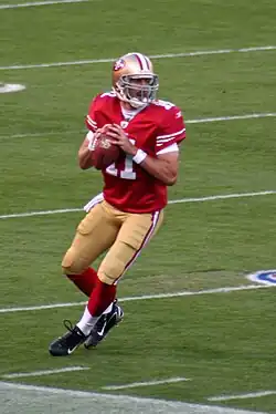 Neuer Coach für die 49ers wurde Mike Nolan, zuvor der Defensivkoordinator der Baltimore Ravens, dessen Vater Dick Nolan die 49ers bereits von 1968 bis 1975 trainiert hatte.[108] Aufgrund der schlechten Saison hatten die 49ers den ersten Pick im NFL Draft 2005. Mit diesem Pick wurde Alex Smith ausgewählt.[109] Die erste Saison von Alex Smith war jedoch schlecht; bei nur einem Touchdown warf er elf Interceptions.[110] Zum zweiten Mal in Folge belegten die 49ers den letzten Platz in der NFC West mit einer Bilanz von 4–12 und verpassten die Play-offs deutlich.[111] Mit dem sechsten Pick im NFL Draft 2006 wählten die 49ers den Tight End Vernon Davis aus.[112] In der darauffolgenden Saison konnten sich die 49ers stark verbessern. Dies lag vor allem am Runningback Frank Gore, der 1.695 Yards und acht Touchdowns erlaufen konnte und damit einen neuen Franchise-Rekord aufstellte.[113] Dennoch wurden die Play-offs erneut verpasst.[111]