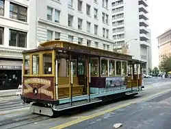 Bei den Kabelbahnen von San Francisco läuft das Seil in einem Graben unterhalb der Straße. Die Wagen greifen mit einer Spannklaue durch einen Schlitz in der Fahrbahn das Seil. Das Seil ist endlos umlaufend. Am Ende einer Linie wird der Wagen auf einer Drehscheibe gedreht und kann auf dem Gegengleis mit dem rücklaufenden Seil zurückfahren. Im Streckennetz von San Francisco gibt es vier Drehscheiben, je eine an den Endhaltestellen Powell/Market, Taylor/Bay und Hyde/Beach sowie eine im Depot an der Kreuzung Mason/Washington. Die Wagen dieser Strecken sind alle genau gleich aufgebaut: zwei Drehgestelle mit je zwei Achsen, Länge über alles 8,4 Meter (27 Fuß 6 Zoll) Breite über alles 2,4 Meter (8 Fuß) und 7030 Kilogramm (15.500 Pfund) schwer mit einer Kapazität von 60 Passagieren, davon 29 Sitzplätze. Die Farbgebung ist jedoch nicht einheitlich, sondern sie erinnert an verschiedene Epochen und verschiedene Betreibergesellschaften.