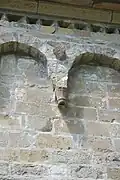 Die aus sorgfältig gearbeiteten Hausteinen errichtete Kirche besitzt noch das ursprüngliche Südportal und einen später geschaffenen Zugang im Westen. Die Fassade wird von lombardischen Bögen und Reliefs mit der Darstellung von Figuren und Pflanzenmotiven geschmückt.