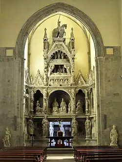 Das Grabmonument von König Ladislao entstand im Auftrag seiner Schwester Johanna II. von Anjou. Es wurde in seinem Todesjahr 1414 begonnen und 1428 vollendet[10] und wird meistens Andrea da Firenze zugeschrieben, könnte jedoch auch ein Gemeinschaftswerk diverser toskanischer und lombardischer Bildhauer sein.[10] Der architektonische Rahmen ist im großen Ganzen noch von gotischen Formen geprägt, obwohl einzelne Elemente, wie der breite halbkreisförmige Bogen in der Mitte bereits auf die Frührenaissance verweisen.