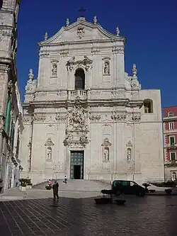 Die feierliche Grundsteinlegung fand am 5. Mai 1747 unter Francesco II. Caracciolo[6], Herzog von Martina, statt, die Segnung erfolgte durch Giovanni Rossi, Erzbischof von Tarent. Der Bau begann durch Handwerker der Familie Morgese aus Bari. Trotz des Todes des Ingenieurs Mariani am 22. Oktober 1747 setzte die Familie Morgese bis 1753 die Arbeiten an der Fassade zunächst fort, wobei sie die Ornamente, das zentrale Hochrelief und die Statuen schuf. Im Jahr 1752 waren der Aufriss, die Seitenwände und die Gegenfassade fertig gestellt. Mit dem 1753 ausgeführten Tonnengewölbe waren nun alle wesentlichen Strukturen der ersten Hälfte der Kirche fertiggestellt. Unmittelbar danach begann die zweite Phase der Arbeiten, die sich über ein Jahrzehnt hinzog, da der Bau von zwei großen Kapellen in den Armen des Kreuzes geplant war. Erst am 18. September 1761 beschloss das Kapitel, die Gottesdienste in die nahe gelegene Kirche Monte Purgatorio zu verlegen, da der Abriss der hinteren Hälfte der alten Kirche bevorstand.