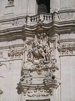 Die Fassade erhebt sich etwa 37 Meter hoch über einen 24 Meter breiten Sockel, der von einer halbrunden Treppe mit elf Stufen eingenommen wird. Die Fassade ist durch ein breites Gesims in zwei übereinander liegende Ordnungen geteilt. Die untere Reihe wird von sechs Pilastern gegliedert, die in römisch-ionischen Friesen als Kapitelle enden, und weist unten vier Nischen mit Marmorstatuen auf, die Johannes den Täufer und Petrus (links) sowie Paulus und Josef (rechts) darstellen. In der Mitte der unteren Reihe befindet sich das Hauptportal mit Architrav und unterbrochenem Tympanon, auf dem zwei Engel und das Hochrelief mit der Darstellung der Episode von St. Martin und dem armen Mann zu sehen sind.