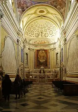 Auf beiden Seiten des Hauptportals öffnen sich zwei Kammern im Mauerwerk, die zwei kleine Kapellen bilden. Auf der linken Seite befand sich während des gesamten 19. Jahrhunderts ein hölzerner Sitz[7], der später durch eine Tafel mit dem lateinischen Text der Erhebung zur Basilica minor ersetzt wurde.[8] Auf der rechten Seite befindet sich das Baptisterium, das 1773 von Crescenzo Trinchese errichtet wurde. Die Nische des Taufbeckens weist verschiedene Elemente aus weißem Marmor und fein gearbeitete Reliefs auf. In der Mitte befindet sich das Taufbecken mit einer achteckigen Struktur in Form einer Säule, die elegant mit floralen Motiven verziert ist und mit einer Skulpturengruppe der Taufe Jesu abschließt. Eine Gedenktafel mit einer langen Widmungsinschrift im Nischenaufsatz und ein kleines Bronzetor in der Balustrade vervollständigen das Bild.