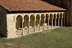 An der Südseite der Kirche befindet sich ein ungewöhnlicher, in regelmäßig behauenen Quadern errichteter Portikus mit zwölf Hufeisenbögen über 13 schlanken, zum Teil wiederverwendeten Säulen mit Blattkapitellen. Die Zahl Zwölf kann als Verweis auf die zwölf Apostel oder die zwölf Tore des himmlischen Jerusalem gedeutet werden. Der Portikus ist der einzige vom Kreuzgang erhaltene Teil; die sieben westlichen Bögen sind von einem Alfiz-Rahmen eingefasst, die fünf östlichen Bögen sind schlichter gestaltet und wurden im 11. Jahrhundert hinzugefügt. Das Kapitell der achten Säule wird der Omayyadenkunst zugerechnet und stammt aus dem 8. Jahrhundert. Es weist Voluten und Sonnensymbole auf.