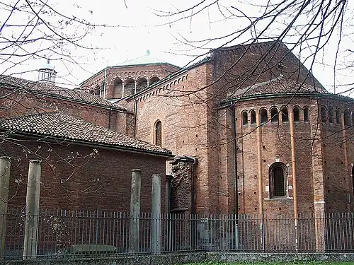 Am 10. Mai 395 oder 396,[2] einer alten Überlieferung zufolge am 10. Mai, überführte Ambrosius die Reliquien des Märtyrers Nazarius in die Basilica apostolorum, indem er die Hauptapsis schuf; der Leichnam des Heiligen wurde in der Mitte davon in einem unterirdischen Loculus untergebracht (wo ihn der heilige Karl Borromäus 1579 fand, als er ihn zum neuen, gegenreformierten Altar brachte). Dieser Teil der Basilika wurde wahrscheinlich mit libyschen Marmoren verkleidet, die, wie eine Inschrift erinnert, auf ein Gelübde der Nichte von Kaiser Theodosius I., Flavia Serena, der Frau von Stilicho, dem Generalvormund von Kaiser Flavius Honorius, gestiftet wurden, der auch den Rest der Basilika verschönerte.