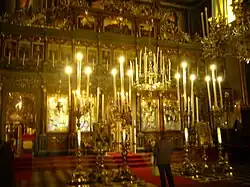 Der einschiffige Kirchenraum wird von einer reich vergoldeten und versilberten Ikonostase dominiert, die wie in Ostkirchen üblich, den Altarraum und den Kirchenraum voneinander trennen. Die Gesamtkonstruktion stammt von einem unbekannten Vertreter des Empirestils. Die Verzierungen der Altarwand zeigen hingegen barocke Formen. Die Ikonostase ist auf Augenhöhe mit zahlreichen Ikonen geschmückt. Sie entstanden zwischen 1839 und 1856 und zeigen von links nach rechts die Heiligen Georg und Spyridon, Nikolaus von Myra, die Heilige Mutter Gottes mit Kind, Christus auf dem Thron, die Heilige Dreifaltigkeit, Johannes den Täufer und die Heilige Katharina von Siena. Über den Heiligenbildern befinden sich 24 goldverzierte Fresken von dem griechischen Maler Giovanni Trigonis, die Szenen aus dem Leben Jesu von der Verkündigung Marias bis zu seiner Himmelfahrt abbilden. Den Abschluss der Ikonostase bilden drei Gemälde: Jesus im Getsemani, die Kreuzabnahme und noli me tangere.