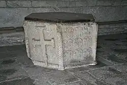 Das sechseckige Taufbecken stammt aus dem 12. Jahrhundert. Das mit Tiergestalten und Ornamenten (darunter auch Seilstäbe) verzierte Becken stand lange Zeit in der benachbarten Pfarrkirche San Michele; es diente später als Brunnen und Blumenschale, bis es in die Kirche San Nicola verbracht wurde.