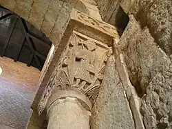 Den Pfeilern des Vierungsquadrates sind Säulen mit figürlich gestalteten Kapitellen vorgelagert. Auf zwei dieser Kapitelle sind Vögel dargestellt, die Trauben picken. An den Seiten befinden sich menschliche Gesichter. Auf den beiden anderen Kapitellen sind biblische Szenen zu sehen. In der einen Szene führt Abraham ein Messer gegen seinen vor ihm auf einem Altar liegenden Sohn Isaak, den die Hand Gottes vor der Tötung bewahrt. Hinter Abraham steht ein Widder als Opfertier bereit. Auf dem oberen Rand des Kapitells ist eine lateinische Inschrift eingemeißelt, deren Übersetzung lautet: „Wo Abraham seinen Sohn Isaak dem Herrn als Opfer darbot“. Eine andere Szene zeigt den Propheten Daniel in der Löwengrube, darüber die Inschrift: „Wo er in die Löwengrube geschickt wurde“. An den Seiten dieser beiden Kapitelle sind die Apostel Petrus, Paulus, Thomas und Philippus dargestellt. Auf den Kämpfern über den Kapitellen verläuft ein Fries von Weinranken, die Kreise bilden und Vögel, menschliche Köpfe oder Trauben umrahmen. Ein weiterer Fries wird einem anderen Künstler oder einer anderen Bildhauerwerkstatt zugeschrieben. Auf ihm sind geometrische Motive dargestellt, Quadrate und in Taubändern gefasste Kreise mit Weinreben, Blütenblättern und Sonnenrädern.