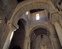 In Höhe der Kämpferzone über den Kapitellen verläuft ein reliefiertes Schmuckband, welches auch die Apsis und das Querhaus miteinschließt; die hier verwendeten Formen sind vielfältig und umfassen sowohl menschliche als auch tierische, pflanzliche und geometrische Motive (Köpfe, Vögel, Weinranken, Kreuze, Wirbel etc.). Bemerkenswert sind die Fächerrosette oberhalb des Apsisfensters und dessen Rahmung in Form eines Alfiz.