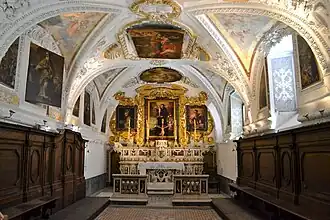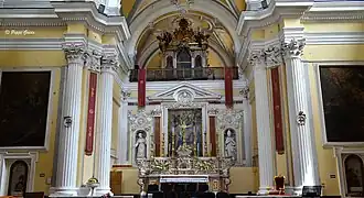 Im Presbyterium gibt es zwei Bilder von Paolo De Matteis von 1709 mit Darstellungen der Heimsuchung Mariä[1] und eine Rosenkranzmadonna;[1] beide Bilder stammen ursprünglich aus der Chiesa del Divino Amore.