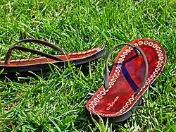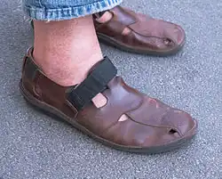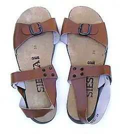 Die Sandale (von griechisch σάνδαλον sándalon bzw. σανδάλιον sandálion (Diminutiv), „Riemenschuh“; ursprüngliche Wortherkunft ungeklärt[1]) ist eine der ältesten Schuhgrundformen, die sich auf eine mit Riemen am Fuß befestigte Sohle beschränkt. Sie ist durch große Luftigkeit und (meist) Leichtigkeit gekennzeichnet. Sandalen haben üblicherweise keinen oder zumindest keinen nennenswerten Absatz; eine feminine Form der Sandale ist die Sandalette, die durch einen höheren Absatz gekennzeichnet ist.
