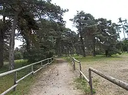 Direkt an die Dünen grenzen Wälder, die zum Teil ebenfalls zum Naturschutzgebiet zählen und als Übergangs- und Pufferzonen dienen. Dort findet man lockere Kiefernbestände neben Eichen und Buchen sowie die sich immer weiter ausbreitende nicht heimische Robinie.[13][6]
