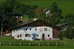 An der Fassade im unteren Bereich sind Wandmalereien mit Resten eines Tierfrieses mit Schlitten, davor Hasen und Hirsche und ein Fries mit der Bezeichnung Dises Haus im Jar 1602 zu sehen. Im Obergeschoß stellen Malereien Kreuzigungsgruppen sowie ein Heiligen- oder Christusmotiv aus dem 17. Jahrhundert und Wandmalereien Mariahilf aus dem Jahre 1754, gemalte Eckquaderungen bei einem Fenster und unter einem Fenster dar.[2]