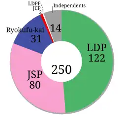 | Sozialistische Partei Japans | 31 | 11.156.060 | 37,58 % | 28 | 8.549.940 | 29,88 % | 21 | 49 | 80 | |