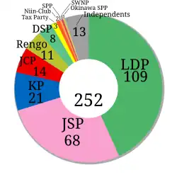 | Sozialistische Partei Japans (SPJ) | 22 | 15.009.451 | 26,38 % | 26 | 19.688.252 | 35,05 % | 20 | 46 | 68 | |