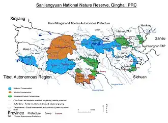 Das Sanjiangyuan-Naturschutzgebiet ist ein Schutzgebiet im Süden der chinesischen Provinz Qinghai. Es ist das zweitgrößte Schutzgebiet der Erde und bedeckt 152.300 Quadratkilometer Land. Auf dieser gewaltigen Fläche, die größer als England und Wales zusammen ist, leben nur etwa 200.000 Menschen. Drei gewaltige Flüsse, der Yangtzekiang, der Gelbe Fluss und der Mekong entspringen in dieser Region und werden von den zahlreichen Feuchtgebieten gespeist. Das Reservat beinhaltet insgesamt 18 besondere Schutzzonen (Conservation Areas), wobei zwischen drei Typen unterschieden wird: (1) Feuchtgebiets-Schutzzonen, (2) Wildschutzzonen und (3) Busch- und Waldschutzzonen.