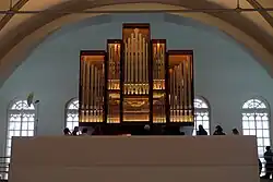 1997 wurde ein Pedalpositiv mit 10 Registern im Chor der Kirche aufgestellt, das den großen Kirchenraum nicht ausfüllen konnte. Nach langer Planungszeit gelang es im Mai 2017, eine mittelgroße gebrauchte Orgel der Deutschen Kirche (Tyska kyrkan) in Stockholm zu erwerben und auf der Empore einzubauen.[8][9] Die Orgel wurde 1972 von dem Kölner Orgelbauer Willi Peter erbaut; Mensuren und Disposition stammen von Ernst Karl Rößler, der Prospekt wurde vom Architekten Andreas Carstens gestaltet. Das Instrument hat 43 Register (3309 Pfeifen) auf drei Manualen und Pedal und folgende Disposition:[10][11]