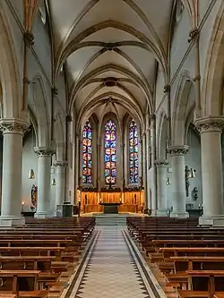 Nach dem Zweiten Weltkrieg entsprachen der dunkle Innenraum und die neugotische Einrichtung nicht mehr dem Zeitgeschmack und den liturgischen Bedürfnissen. Daher wurde 1959 ein Konzept für die Erneuerung der Kirche erarbeitet, das von 1961 bis 1964 umgesetzt wurde. Die Vollplastik im Tympanon und die Reliefs an den Türen wurden von Toni Schneider-Manzell entworfen. Der Innenraum wurde von Zierrat befreit und durch Farbgebung und höhere Chorfenster erhellt. Wilhelm Geyer aus Ulm gestaltete die Chorfenster, die Szenen der Heilsgeschichte zeigen.
