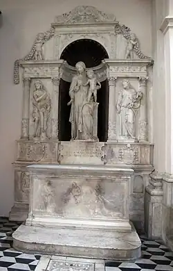 Durch die erste Arkade links betritt man zunächst einen Vorraum mit einem Relief der Kreuzigung mit Maria, Johannes und Magdalena von Giulio Mazzoni und rechts einem Gemälde der Himmelfahrt Christi mit den Heiligen Sebastian und Nikolaus von Bari eines anonymen Künstlers um 1500.[4]