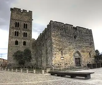 - Die ehemalige Klosterkirche und heutige Pfarrkirche (Esglesia Sant Miquel) ist ein wehrhaft wirkender und größtenteils aus exakt bearbeiteten Hausteinen errichteter Bau des ausgehenden 11. oder beginnenden 12. Jahrhunderts. Die drei Apsiden sowie der Turm zeigen Lisenen und Rundbogenfriese im lombardischen Baustil; sie wurden später, d. h. möglicherweise in der Zeit des Katalanischen Bürgerkriegs (1462–1472) durch Wehrbauten aufgestockt. Der auf der Nordseite befindliche und beinahe freistehende Glockenturm (campanar) ist romanischen Ursprungs; er wurde jedoch ebenfalls im 15. Jahrhundert befestigt und zeigt zusätzlich kleine Zahnschnittfriese oberhalb der Rundbögen. Auch das Langhaus und die giebel- und schmucklose Westseite haben Wehrcharakter. Das in gotischen Stilformen gestaltete, aber teilweise zerstörte Eingangsportal trägt eine Inschrift des Jahres 1802; die Kapitelle zeigen Abwandlungen des Trifrons-Motivs. Das dreischiffige Innere ist tonnengewölbt; die Apsiden sind von halbkuppelförmigen Kalotten überwölbt. Zur Ausstattung gehören mehrere teils geometrisch, teils vegetabilisch gestaltete Kapitelle, ein romanisches Taufbecken und ein aus einem Kapitell herausgearbeitetes Weihwasserbecken. Vom ehemaligen Klausurbereich des Klosters mitsamt seinem Kreuzgang sind nur Fundamentreste erhalten.