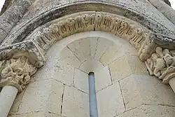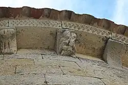 Ein steiler, überwölbter Durchgang im Untergeschoss des Rundturmes ermöglicht den Zugang zur Außenseite der Apsis. Zwei Dreiviertelsäulen gliedern die Apsis in drei von je einem Rundbogenfenster durchbrochene Felder. Die Archivolten der Fenster sind mit einem Fries von eingerollten Blättern und ineinanderverschlungenen Blattranken verziert. Auf den beiden Kapitellen des mittleren Apsisfensters sind geflügelte Löwen und Harpyien mit phrygischen Mützen zu erkennen. Unter dem Dachansatz der Apsis verläuft ein Gesims, das von Kragsteinen mit Tier- und Menschendarstellungen getragen wird.