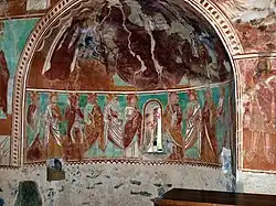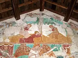 In der Kirche befinden sich farbkräftige Fresken mit religiösen Motiven. Unter ihnen ragt die Darstellung des Christus Pantokrator (deutsch „Christus, der Weltenherrscher“) heraus, der eine Schrift mit dem Text Ego Sum Lux Mundi Et Via Veritas (deutsch „Ich bin das Licht der Welt, der Weg und die Wahrheit“) in den Händen hält. Zu sehen ist auch der gekreuzigte Jesus vor den Mauern von Jerusalem im Beisein der Jungfrau Maria, des Heiligen Johannes und Maria Magdalenas. Weiterhin sind ein Verkündigungsengel, der Apostel Bartolomäus, Erzengel Gabriel und Erzengel Michael, die Heilige Margareta von Antiochia, der Heilige Bernhardin von Siena, der Heilige Sebastian, der Heilige Antonius, Johannes der Täufer, der Heilige Hippolyt sowie der Heilige Christophorus, der das Jesuskind in einem fischreichen Gewässer trägt, abgebildet. Daneben ist die Heilige Christina von Bolsena abgebildet. Ihr und Hippolyt ist die Kirche geweiht.